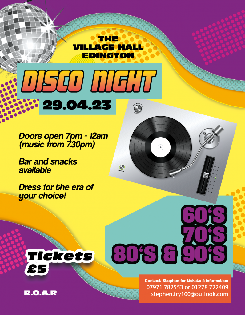 Come and boogie the night away at the next village hall event on Saturday 29th April at The Village Hall, Edington.